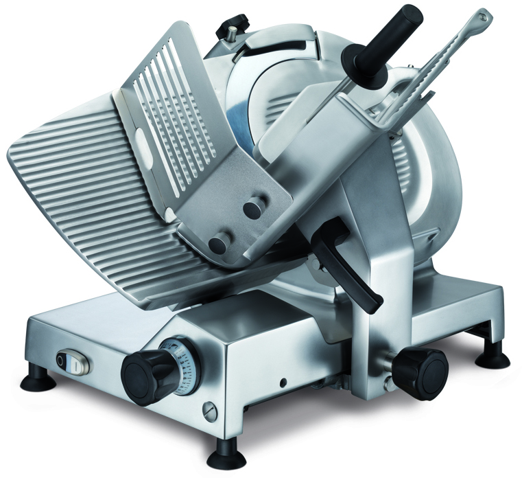 Cortadora de engranajes adecuada para el corte de embutidos y quesos, es muy es compacta perfecta en locales pequeños. Ideal para las actividades frecuente cambio de producto a cortar.